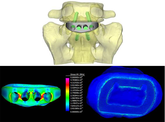 Shown here is the stress distribution in the device (left) and contacting endplate anatomy (right). Note the even distribution of low stress (green colours) in the endplate.